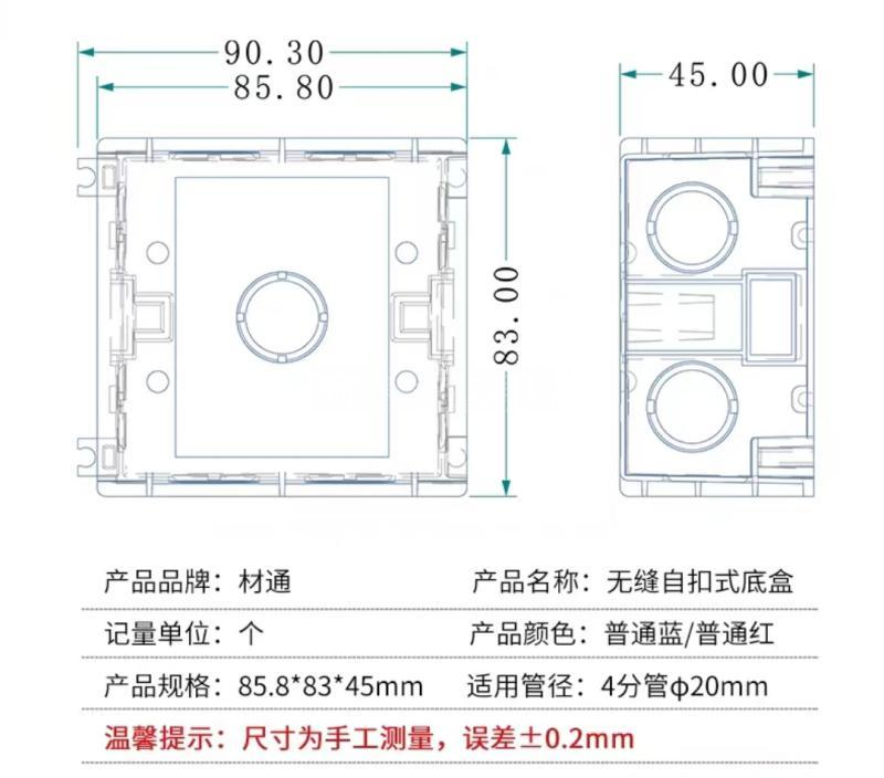 加厚型底盒,无缝自扣式设计,施工操作便捷,多个底盒拼接平整,安装开关插座面板缝隙均匀紧致,美观大气;底盒结构牢固不易变形,能有效阻挡水泥砂浆进入底盒;还研发了薄底盒用于降低剪力墙、天花板、柱子等开槽的破坏。